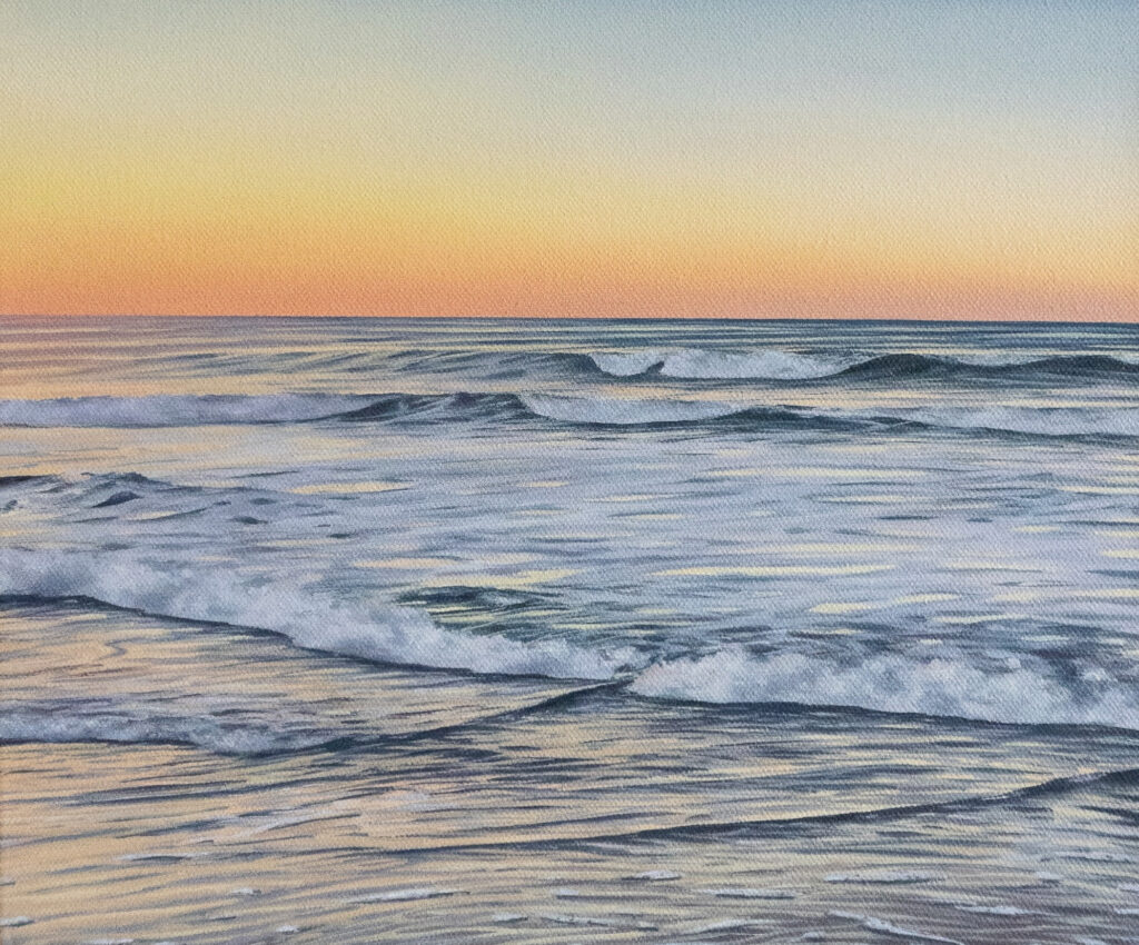 Alice’s practice stems from a deep love for nature and a desire to capture fleeting moments of beauty, finding endless inspiration in the Victorian coastline she now calls home. Her work focuses on depicting the ‘magic hour’ which comes with early morning and evening; taking inspiration from seasonal changes, as well as the transformative quality of light and how this adds to the feeling of a place. As a result, her paintings are often quiet, calm and reflective.