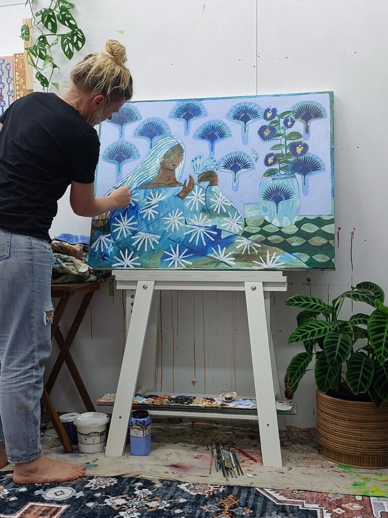 Residing in the quaint suburb of Helensburgh, her serene yet colourful studio is complemented by Indigo Designs Co, a sanctuary that supports women in business and a supportive network. It's full of handcrafted items, tapestries, crystals, feathers that feed her inspirations. Her studio she calls home away from home because it lives in comfort , peace and creativity.