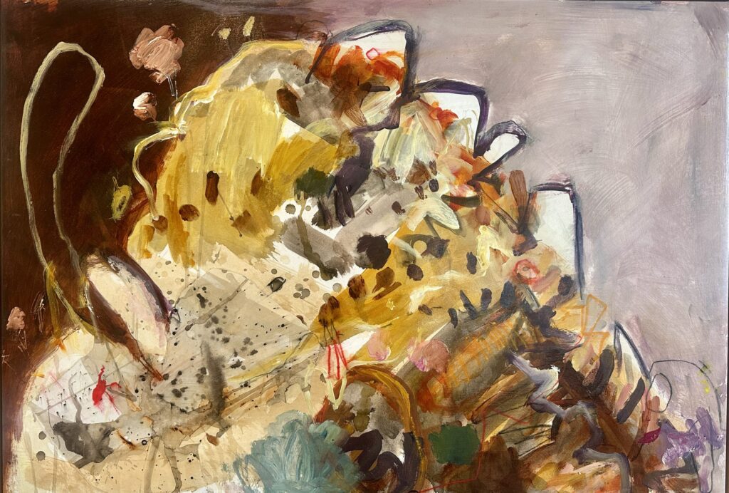 I start by making a response to the landscape by painting on site. I use paper and different mediums to make marks. I then return to the studio where I will deconstruct the made marks by using them as collage in my work. I build layers with collage and many mediums including glazes ,until the scene emerges.