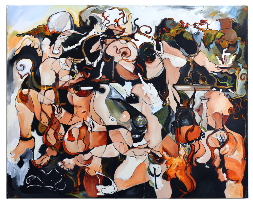 I honestly try and incorporate as many as possible and it’s an issue. I absolutely love painting with oils but I work in a space that isn’t very well ventilated and I get verrrry messy. I’ve stained many rental carpets with oils and thinners.<p> I’m also impatient, impulsive, often chaotic in my workspace. Constantly I need to reign myself in, to stop trialling new mediums and buying endless supplies when sad and lonely older work is sitting there waiting for me to finish it.<p> I am attracted to layering quickly, without waiting for drying times and allowing accidents (mistakes) to occur which often lead to new ideas or techniques so I mostly use acrylic, aerosols, inks etc. I like to attempt new, unfamiliar processes within this to force a slower pace as well.<p> As well as oil paint, I work with textiles and film mediums. I’ve been making videos since my first digi cam in the early 2000s and I started printing on fabric about a year and a half ago when I was broke and bored with my clothes.