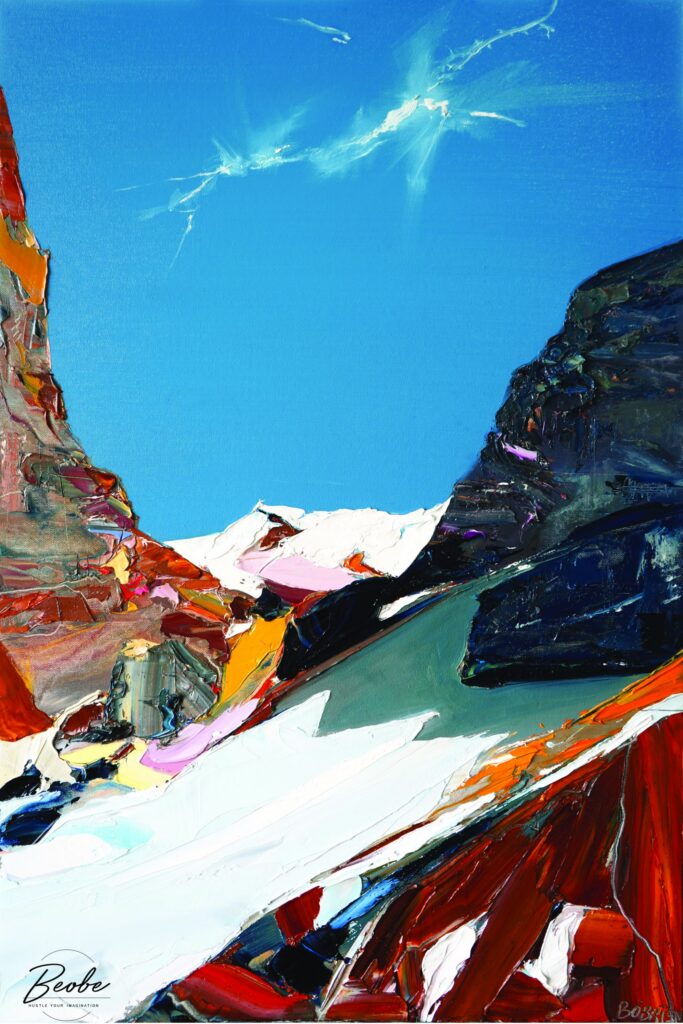 I start with a spark, usually a place, a light, or a feeling I can’t shake. From there, I dive straight in with oils, brushes, and palette knives, building layers wet on wet until the landscape comes alive. Once it feels right, it dries, gets framed, and heads off to galleries. The process is messy, intuitive, and a little wild, just like the landscapes themselves.