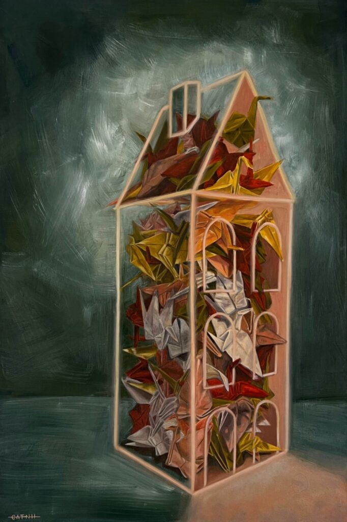 Working primarily in oils, Catherine explores themes of memory, identity, and emotional weight through a lens that blends realism with subtle surrealism. Her compositions often feature everyday objects and spaces, transformed by context and metaphor to evoke inner tension, cultural complexity, and lived experience.