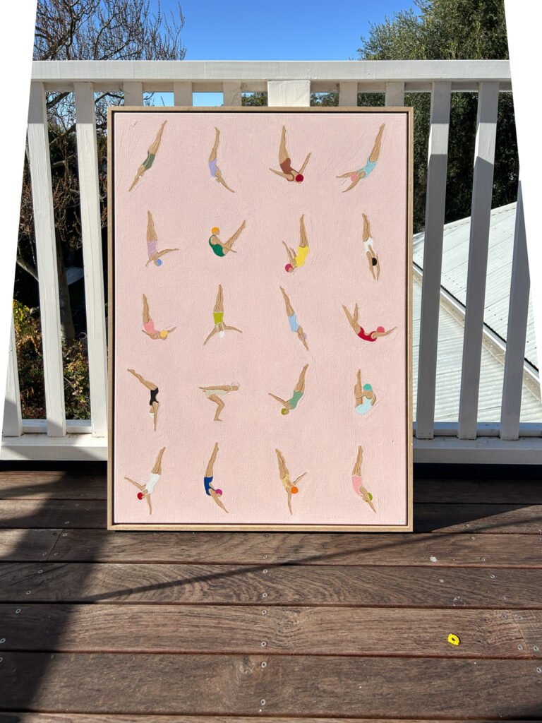 Belle is an emerging artist living in on the Bellarine Peninsula, Victoria. Belle uses inspiration from the beach/native environment around her to create colourful floral pieces and the twisting shapes of retro divers in bathers. Belle also paints still life table scapes drawing inspiration from the good times spent around the table enjoying a beverage and good food. Belle paints happy paintings focusing on bright colours and pattern work.