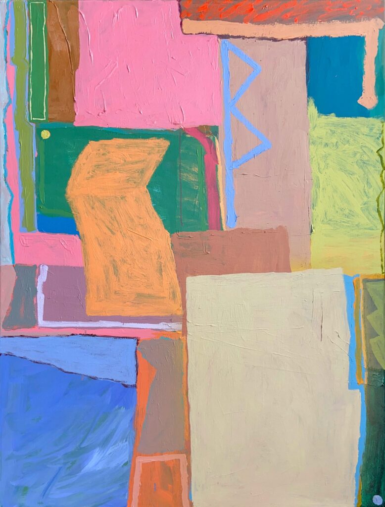 I always start with a coloured ground but with no preconceived ideas on what I’m going to create. The first layer is completely free and spontaneous, generally loose lines and swathes of colour and gestural marks. The following layers are more considered as I start to work on the overall composition. My approach is intuitive and I always work on several surfaces at a time creating a conversation between each other and a cohesive body of work as a whole.