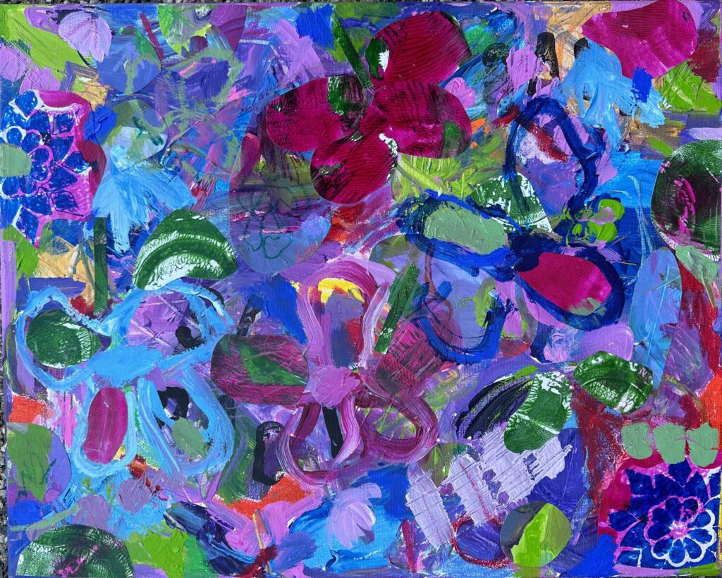 Her current work using acrylics and mixed media focuses on capturing small moments from everyday life using vibrant colours. She is interested in showing the gems of wonder that can be found in simplicity and creates this in her abstract paintings using colour, texture and movement.