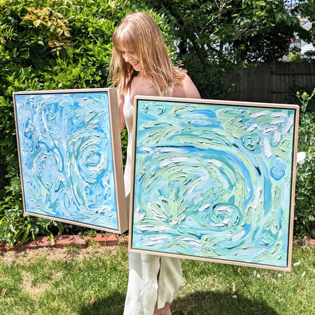 Each piece of my art starts from a memory, feelings or simply just a colour. My first few layers on the canvas are very loose and I enjoy the freedom to play, exploring colour placement and creating motion across the canvas. From here I build on each layer until I reach my distinctive style filled with expressive movement, colour and texture. Each piece is then finished with a protective varnish, signed on the back, initialed on the front and framed in hardwood timber.