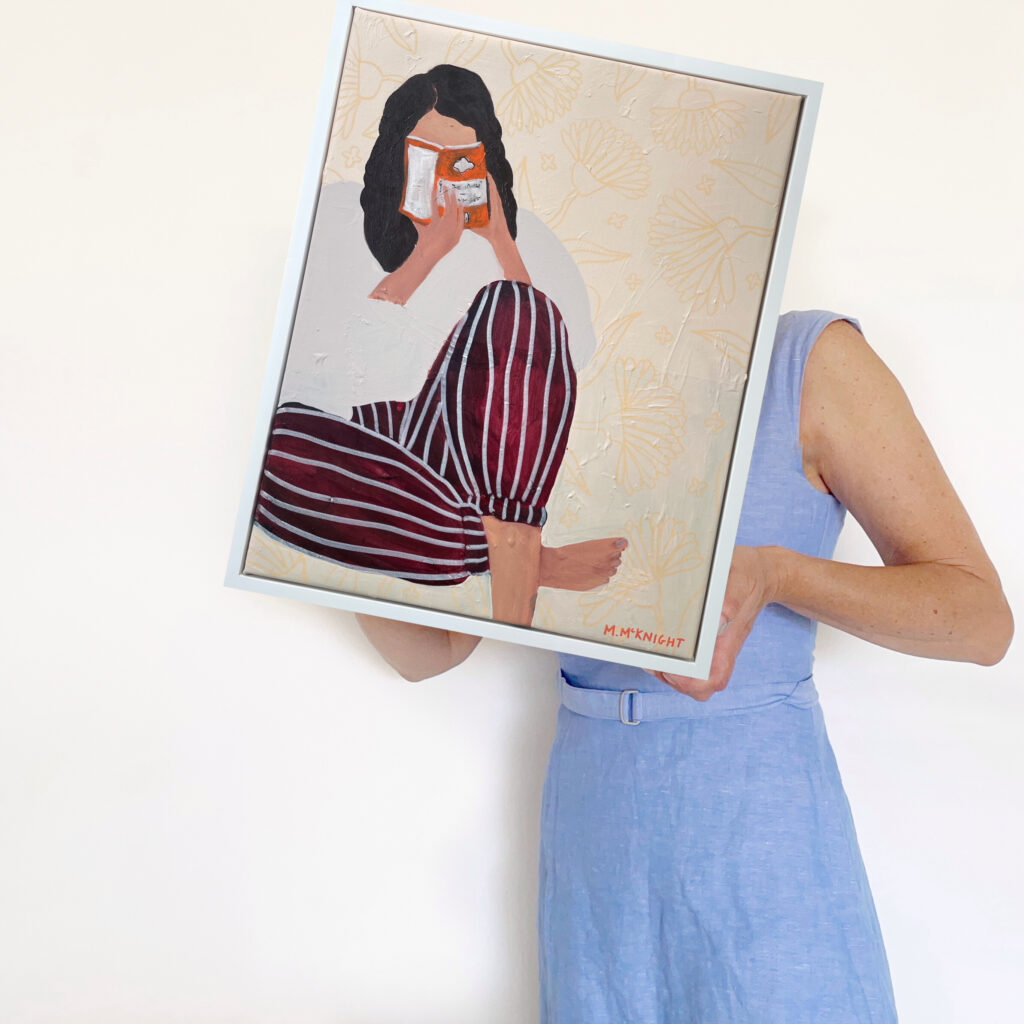 Internationally collected artist Marnie McKnight turned her hobby into a career in 2016 to immediate success. She is primarily known as an abstract expressionist painter working with acrylics and oils, but often releases capsule collections exploring other styles and mediums. Her new “Light Reading” series is selling out everywhere and plays on her love of books, the women depicted often a variation of Marnie who when not in the studio creating art is writing and reading books.