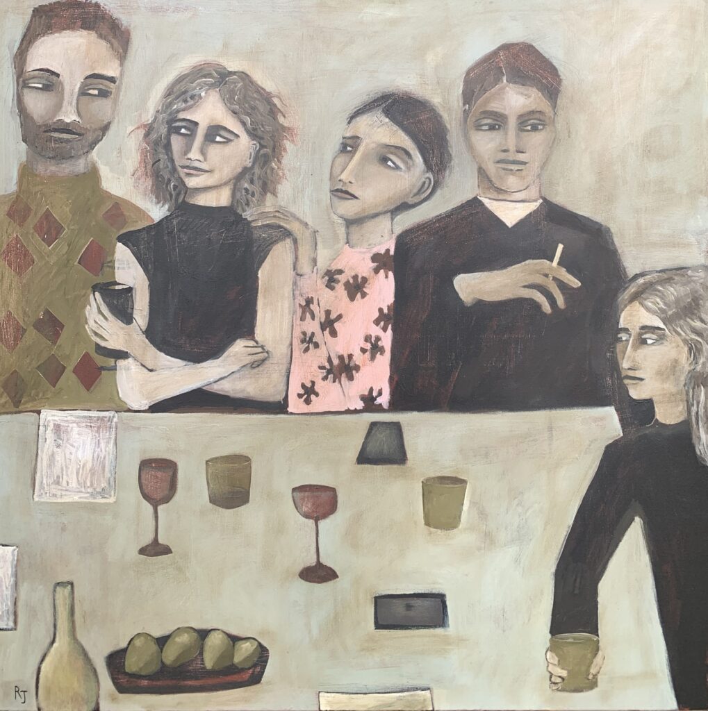 With her paintings Rebecca attempts to capture the moments that make up a life — that first morning cup of tea, the warmth of a wood fire on a cold day, conversations with friends, the beauty of a vase of flowers or a bowl of fruit. She paints with a sense of appreciation for the beauty and chaos of humanity and the world we inhabit. Her paintings encourage the viewer to pause for a moment, to consider and wonder about the people and objects within. There is an element of the familiar in her work, something we all recognise, and we are invited to enter the narrative of the picture, to interpret it through the lens of our own experiences, our own complex lives.
