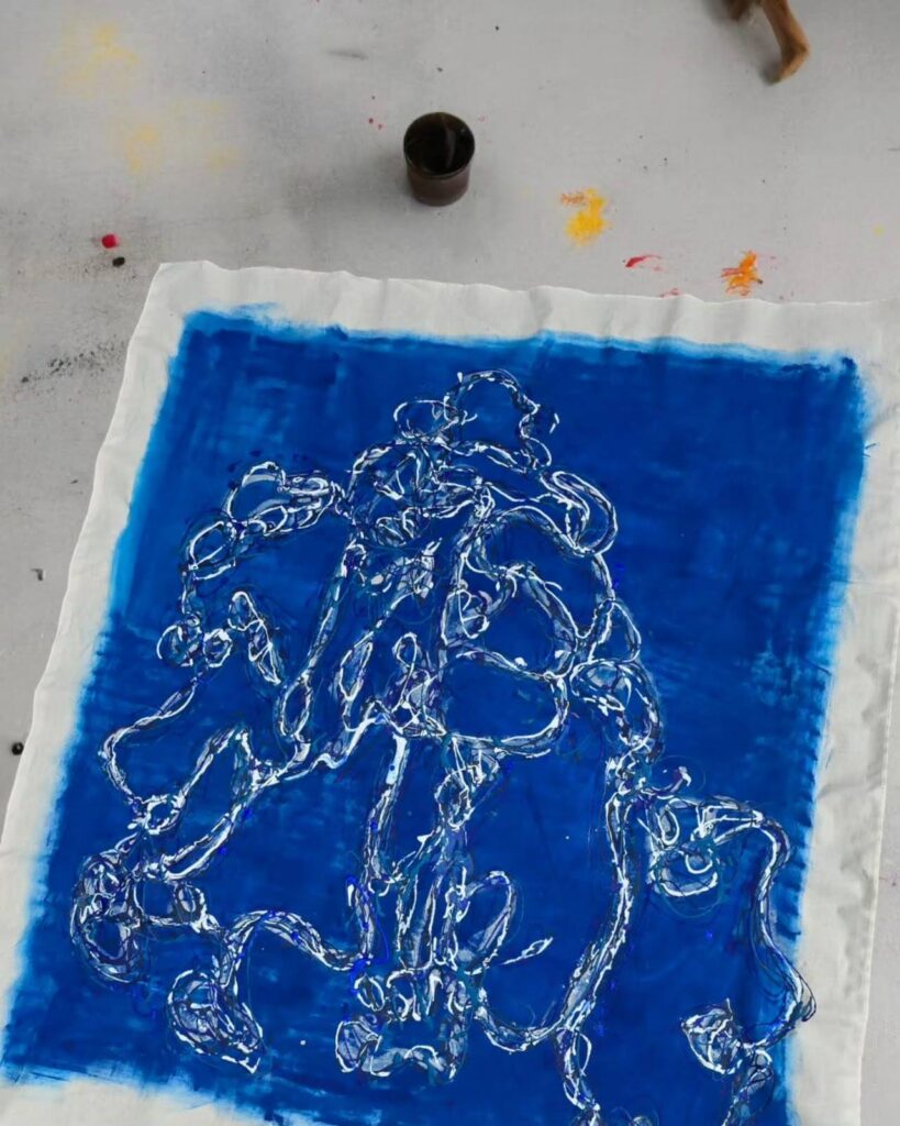 I mostly use fast-drying materials like acrylics, spray paint, pastels, crayons, gouache, and color pencils in my artwork. I prefer these mediums because they allow me to quickly transfer my thoughts and emotions onto paper or canvas. I like working in layers, so it's important to use materials that dry quickly between each layer.